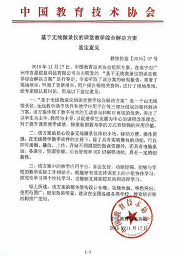 鑒定意見高度評價了吉星無線微錄儀解決方案,專家們認為:吉星無線微錄儀解決方案整體架構設計合理、功能全面、特色突出、使用范圍廣,應用效果明顯。建議在全國各級各類學校、教育培訓等機構推廣使用。