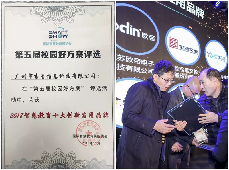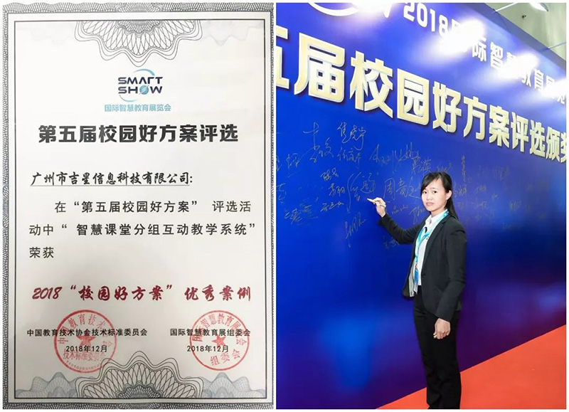 在2018國際智慧教育展上,吉星展示了基于數(shù)字化校園以學(xué)生為中心的智慧課堂分組互動教學(xué)系統(tǒng)方案收獲了客戶的一致好評,并榮獲 2018“校園好方案”優(yōu)秀案例,吉星信息科技被評為2018智慧教育十大創(chuàng)新應(yīng)用品牌!
