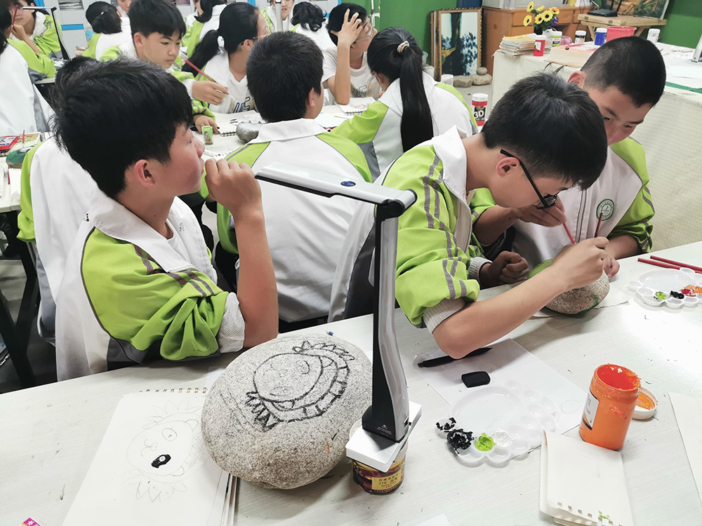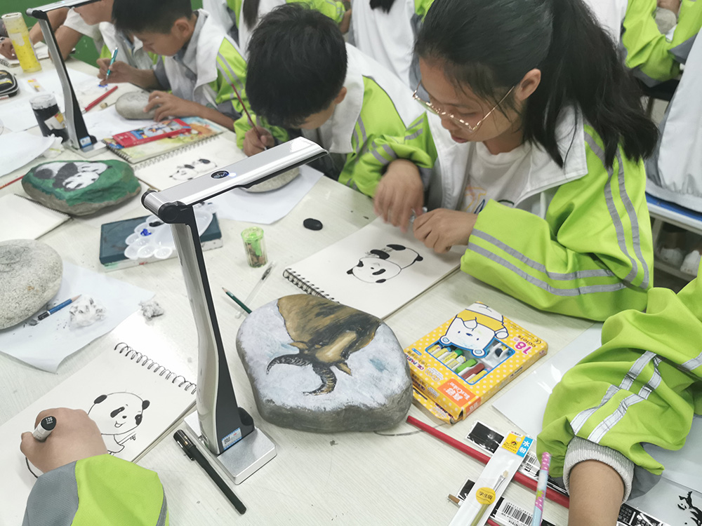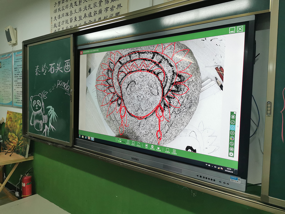 在熊貓石頭畫美術(shù)課上,師生們正在使用吉星捐贈的未來智慧美術(shù)全互動系統(tǒng)進(jìn)行美術(shù)教學(xué)。