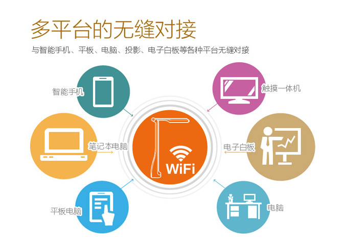 無線視頻展臺可以通過WIFI同步連接到電子白板、一體機、電腦、筆記本、平板、手機,在課堂上用各種設備觀看的同時還可以將老師的教學過程錄制下來,隨時隨地回放視頻,方便學生溫故知新 。