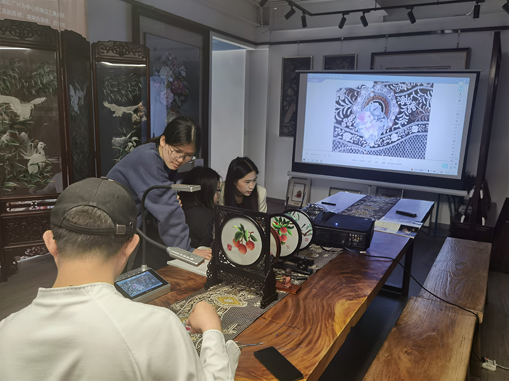 1月4日,在廣繡培訓基地,吉星無線全錄播就在現場展示了廣繡教學的新可能。由廣州市非物質文化遺產廣繡項目代表性傳承人王新元大師現場展示廣繡的刺繡針路和繡法技巧。