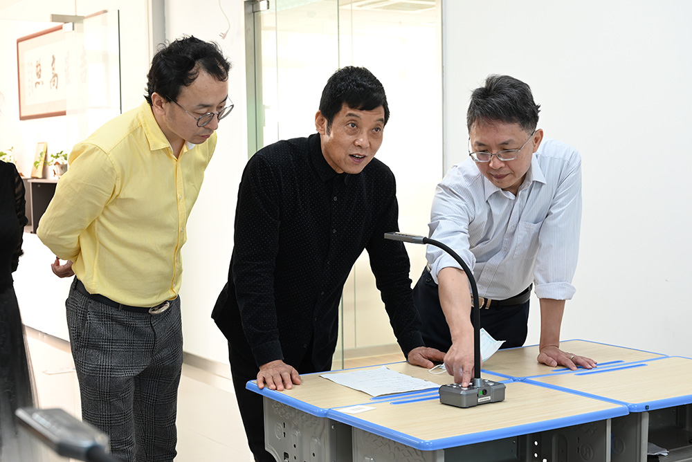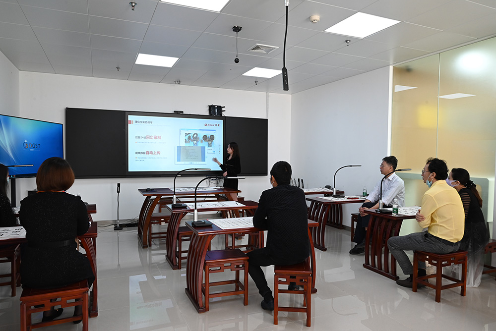 廣東省教育裝備行業協會王自成會長、王桂花秘書長,廣東省國學教育促進會路琦秘書長一行深度體驗了無線全錄播、強交互專遞課堂、理化生實驗教考系統的實際運用。