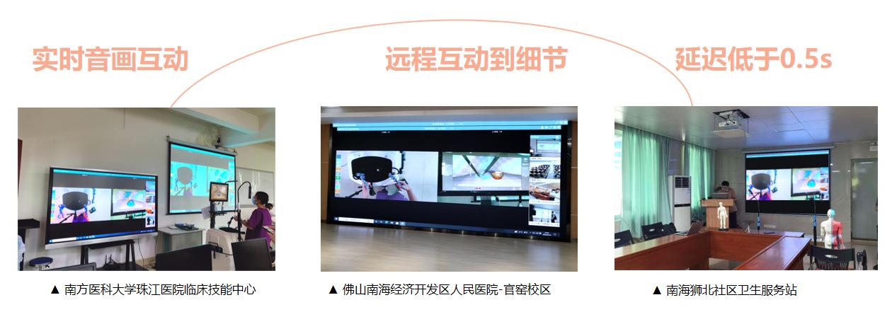 南方醫(yī)科大學(xué)珠江醫(yī)院臨床技能中心通過多模態(tài)強(qiáng)交互系統(tǒng),實(shí)現(xiàn)與南海經(jīng)濟(jì)開發(fā)區(qū)人民醫(yī)院-官窯校區(qū)、獅北服務(wù)站3方互聯(lián)互通,進(jìn)行遠(yuǎn)程培訓(xùn),異地展示老師的手法和機(jī)器內(nèi)部的操作細(xì)節(jié),異地培訓(xùn)教學(xué)也可達(dá)到面對面效果,共享優(yōu)質(zhì)的醫(yī)療設(shè)備資源,擴(kuò)大名師的教學(xué)受眾面,提高培訓(xùn)的質(zhì)量。
