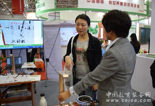 其中,“展示互動書法教學”成了大家圍觀的焦點。展示互動書法教學,即課堂上老師在無線展臺下進行書法過程展示,畫面通過無線WiFi傳輸到大屏幕,大家可以通過清晰地觀察老師的執筆方式、筆鋒走向和字體結構,進行同步臨摹學習。