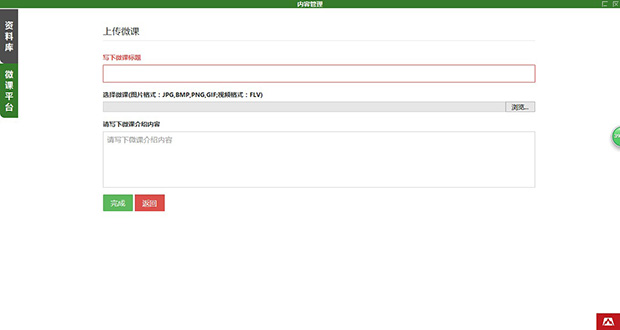基于視頻展示互動課堂的微課學習平臺,是一個以微課為媒介、線上線下相結合的校園微課互動學習平臺。基于該平臺,老師可上傳錄制好的微課(關鍵知識點講解、典型學生作業講解、學生典型問題講解等),供學生觀看學習;學生可在課后通過微課平臺預習和復習相關知識點,也可自制微課,供其它同學和老師觀看;學校可通過該平臺,及時了解各班級教學質量及學習情況。
